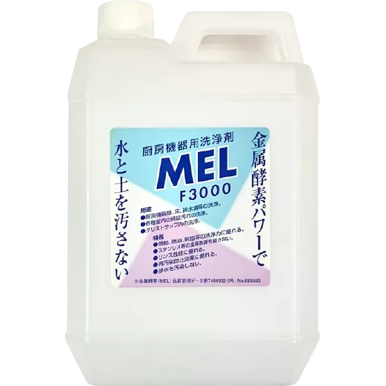 ポップコーンマシンの釜に付着したキャラメル汚れを乳化分解する機能に優れたアルカリ型の洗浄剤。各種厨房機器(換気扇、ガスレンジ、グリル等)の脂汚れや床や排水溝、グリスストラップ等の油脂、炭水化物、繊維等の汚れを乳化分解します。(その他陶器、磁器タイル、コンクリート、各種ステンレス製品樹脂類、除菌、消臭、キレート機能に優れる。)多価グリコール酸、金属酵素(MEL)等を主成分とし、環境の保護保全を考え、塩素等の物質を一切使用していない。すすぎが簡単容易で、優れたリンス効果があります。毒性、引火性はありません。